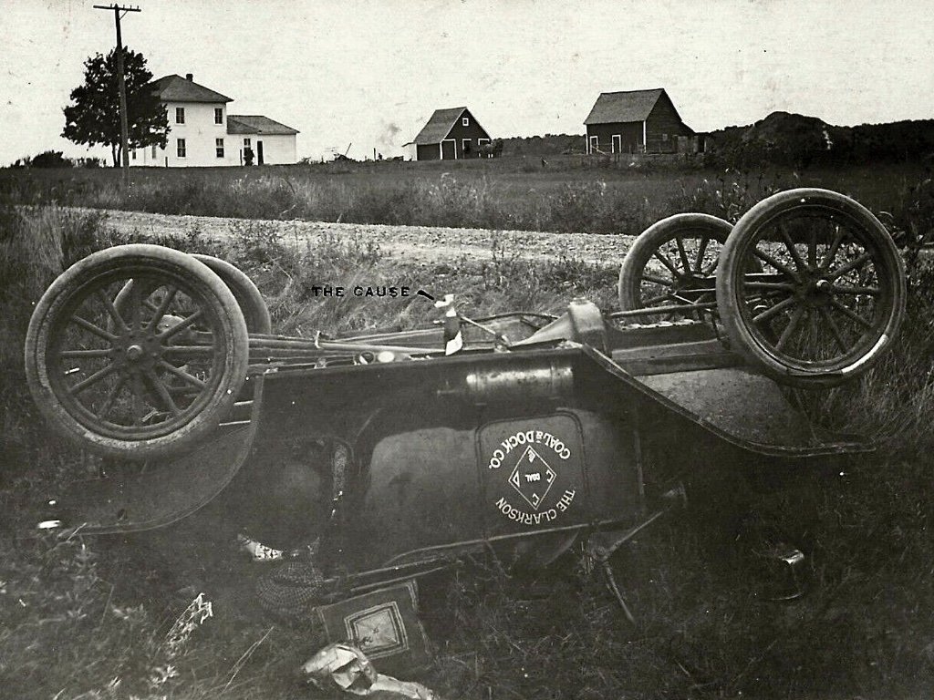 Somewhere along the way they ran off the road and the car was on it's side in a ditch. Many people came along to look. My grandfather said," Help me get the car back on it's wheels on the road". They picked it up and put it back on the road and grandpa thanked them and they got in and completed the trip!