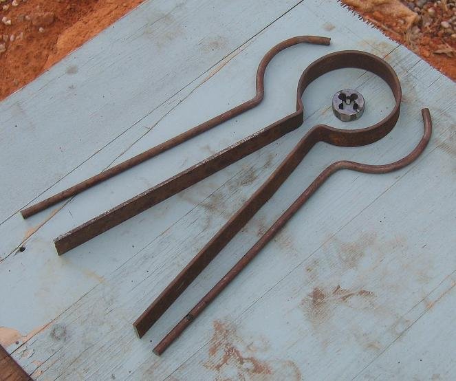 I do not recall what I used for the cutters. It was a common bolt size, something under a half inch (may have been a 3/8?), with a tread count/pitch the same as the model T hubcap. I don't recall what that was either, but if you have a thread gauge, it should be easy to determine. The thread die I used had four 'chip' holes between four sets of cutters, common hardware store thread die. I cut/cleaved though the chip holes. Then, using a good thread hub, I CAREFULLY (the tricky part!!!) placed the four cutters (the order should be kept as per original!) around the hub's threads, using the hub's threads to hold them in alignment. With the carefully sized handle held clamped around the cutters holding everything in place (I used electrical tape out on the handle to hold it clamped), I brazed each of the cutters inside the handle clamp circle.