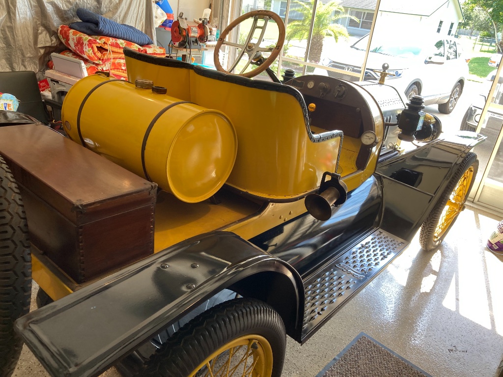 Hood and front fenders are basically 1915. Hood former, rear fenders, and lamps are 1914 or earlier. The Rajo, the Ruckstell, the Atwater Kent, the steering wheel. all are later accessories. Most were not manufactured until about 1920. The wheels might be as early as the late 1910s. From these photos, most of the rest of the car, I can't tell what year the parts are.