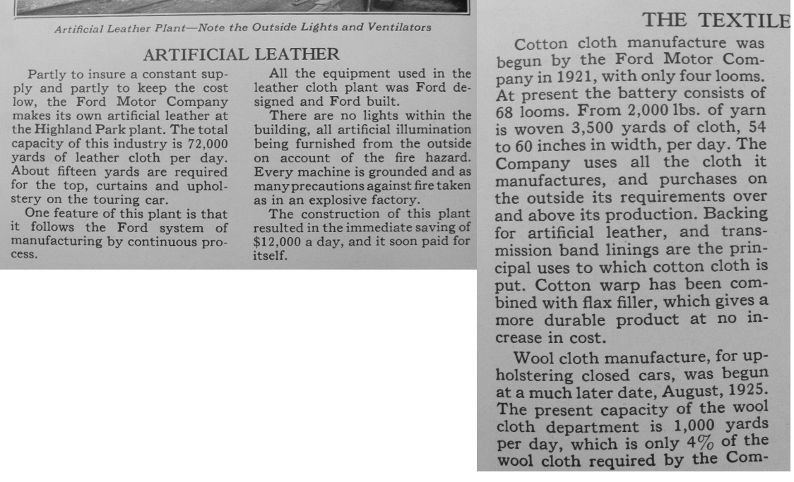 As for the artificial leather Ford used, by 1921 Ford was making its own cotton textiles, 68 looms, each weaving 3,500 yards a day, 60" wide. Used for band linings,and backing for the Ford LeatherCloth. The Highland Park plant made 72,000 yards of LeatherCloth per day. 15 yards used for the top, curtains, and upholstery on the touring.