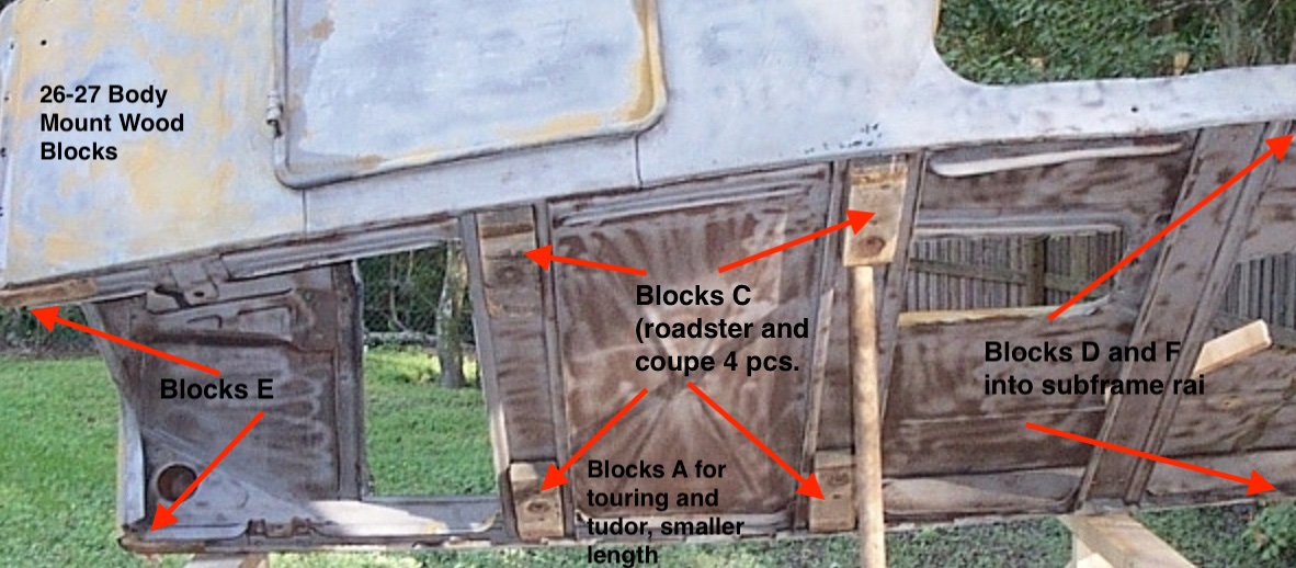I need to make the wooden mount blocks but the ones that were in mine basically were sawdust and some were missing. Has anyone got a photo of them installed and has anyone got the dimensions of the blocks and the cutouts so I can make some? Were there any under the running boards?