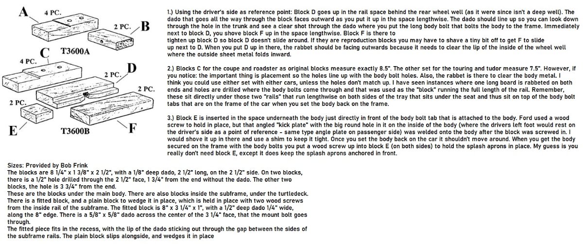 I need to make the wooden mount blocks but the ones that were in mine basically were sawdust and some were missing. Has anyone got a photo of them installed and has anyone got the dimensions of the blocks and the cutouts so I can make some? Were there any under the running boards?