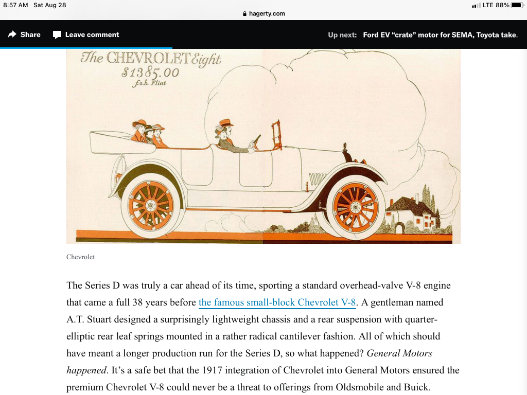 I believe that Ford did some experimenting with engine configurations, including an X-8. Both Ford and Cheverolet stuck with the inline 4 as being the most practical engine for a low price car until 1929 in the case of Chevrolet and 1932 in the case of Ford. That thinking concerning 4 cylinder engines holds true today. Ford built a good many V8s in Lincoln cars, and went V8 gaga from 1932 onward. Unlike the early Chevrolet and Oldsmobile (?Pontiac?) V8s , Ford's early V8 was a roaring success, and the basic layout remained in production until the 1954 model year.