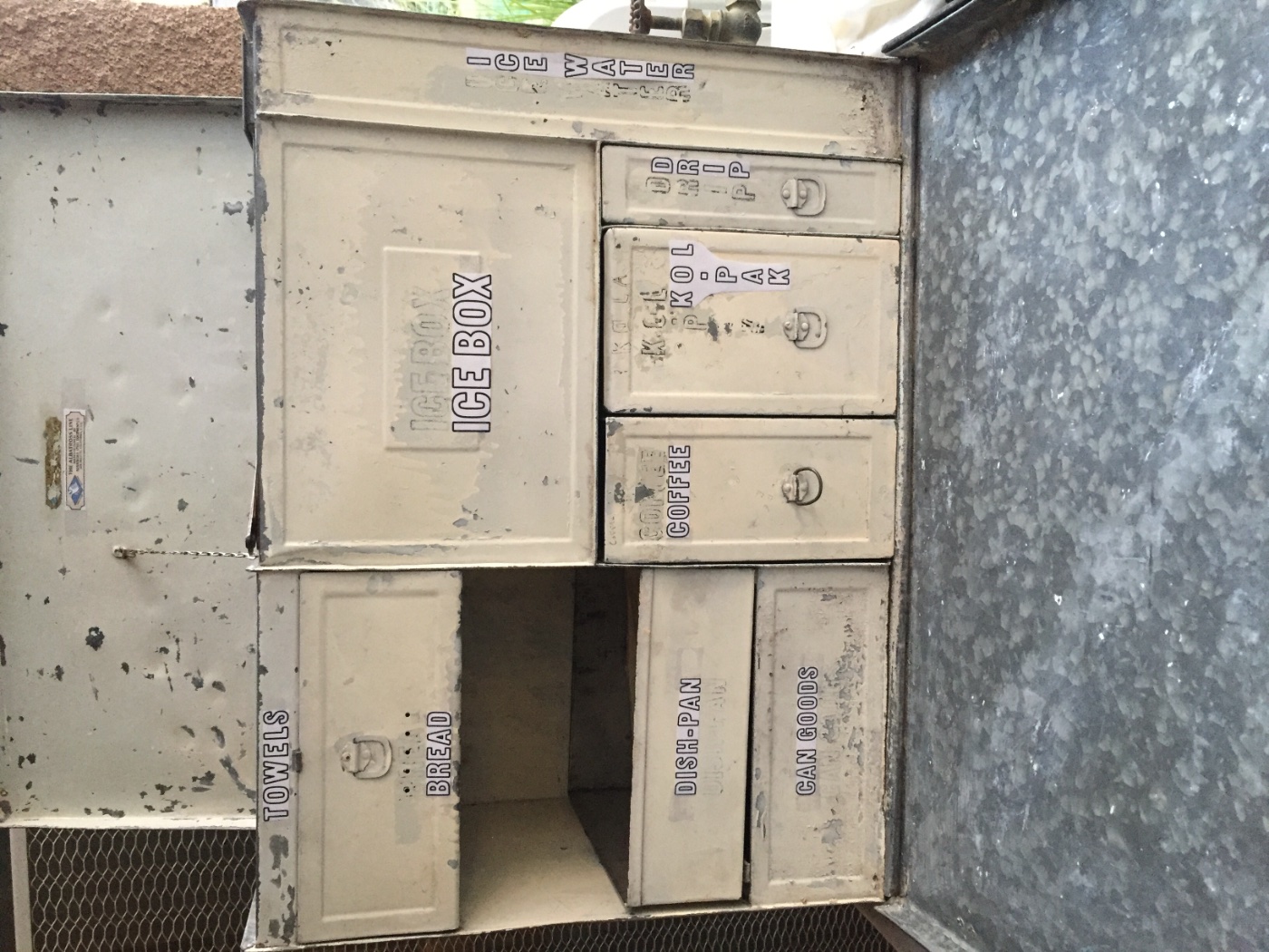 5. The photo of the front of the small kitchenette shows the letters I was able to reveal with lacquer thinner and steel wool. It is possible to read all the words except the ICE WATER tank letters. But it is reasonable to assume that is what was used on the tank as the other two sizes also used ICE WATER letters.