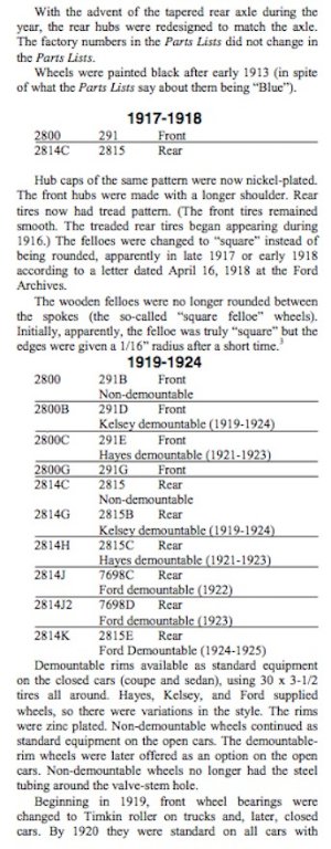 I held off posting on this because I didn't want to get into a what's correct contest. Frist of all the metal fello non-demountables in 24", ( 30 x 3 ), are very hard to find in useable condition, most are rusty and sharp and require a lot of work and new custom spokes. The 23", ( 30 x 3.5 ) metal fello non-demountable seem to be a little easier to find but not by much. I would say this is because in later years of 1925 -1935 the 30 x 3.5 oversize tires would have been more plentiful as used tires, replacing older wood fello front wheels. Also many cars that were non-electric were later upgraded to demountable wheels. And then there is the hotroders that went big time after 1923 roadsters with their sloping windshield, larger turtle deck, and low radiator. So a original 1923 non-electric roadster is very special and restored as such. Now we do know of a low mileage 1917 touring that is original, ( The Ripvanwinkel T ), yet the judging guide lines would find several things supposedly wrong with this car when it was frist photographed for The Vintage Ford. My point is that over the years I have seen a few original 1923 non-electric cars that have been stored for many years and they had the square fello non-demountable wood wheels. I have looked at many pictures taken of new 1923 open cars with non-demountables and they had the square fello wood wheels. Now I don't know what ACCA judging says about the 1923 wheels, but if you can find photo evidence of new cars with the square fello they have to to be wood. I would start by looking at the coffee table big picture Ford Row Books from the 1980"s, I would have looked at mine but they are packed away for house remodeling. Best wishes on you 1923 and keep the wood fello wheels if they are in good condition.