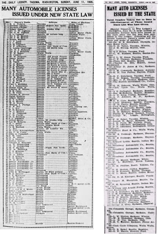 By the end of June, 1905, The Washington Automobile Co. has had good success selling Fords. The two articles below report that of 23 cars registered to residents of Tacoma, 10 are Fords: