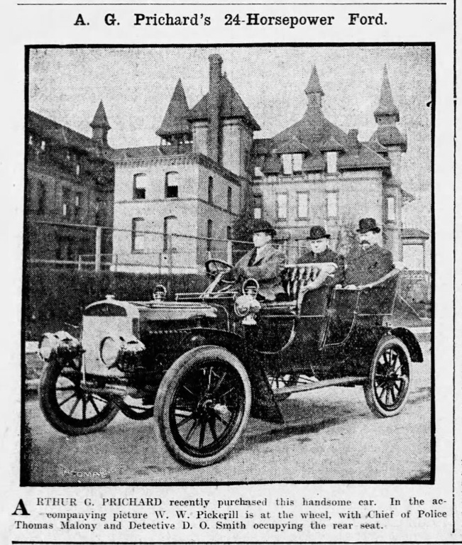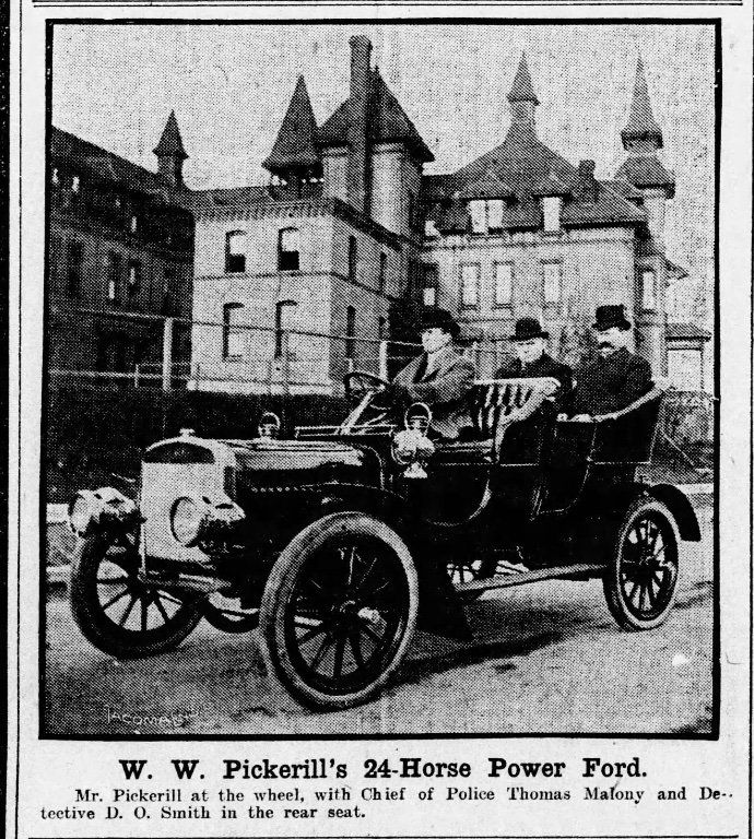 The story went on to report about his auto business, adding "Pickerill bought a Ford - a red and racy Ford that boasted six cylinders."