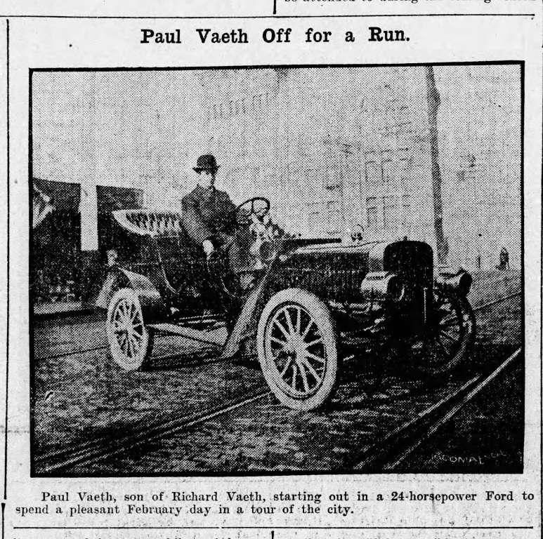 Meanwhile, we learn that Richard Vaeth, a prominent Tacoma resident, has sold his Ford Model B, and is planning to build a grange to house his new machine: