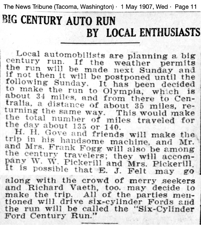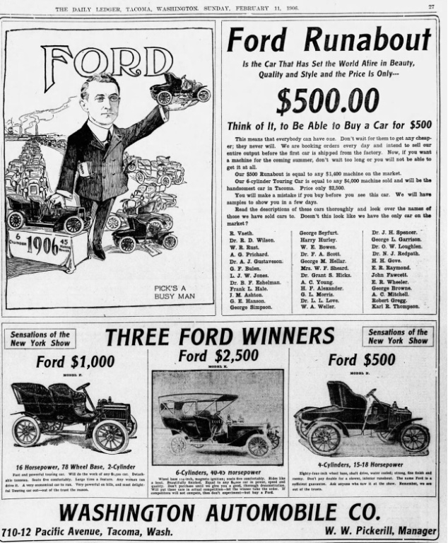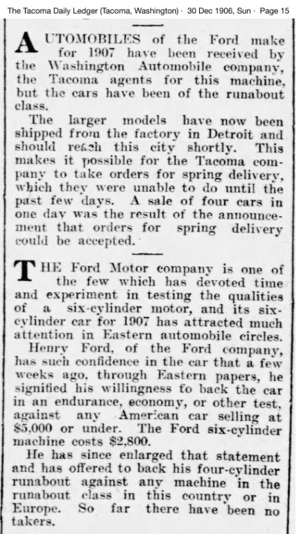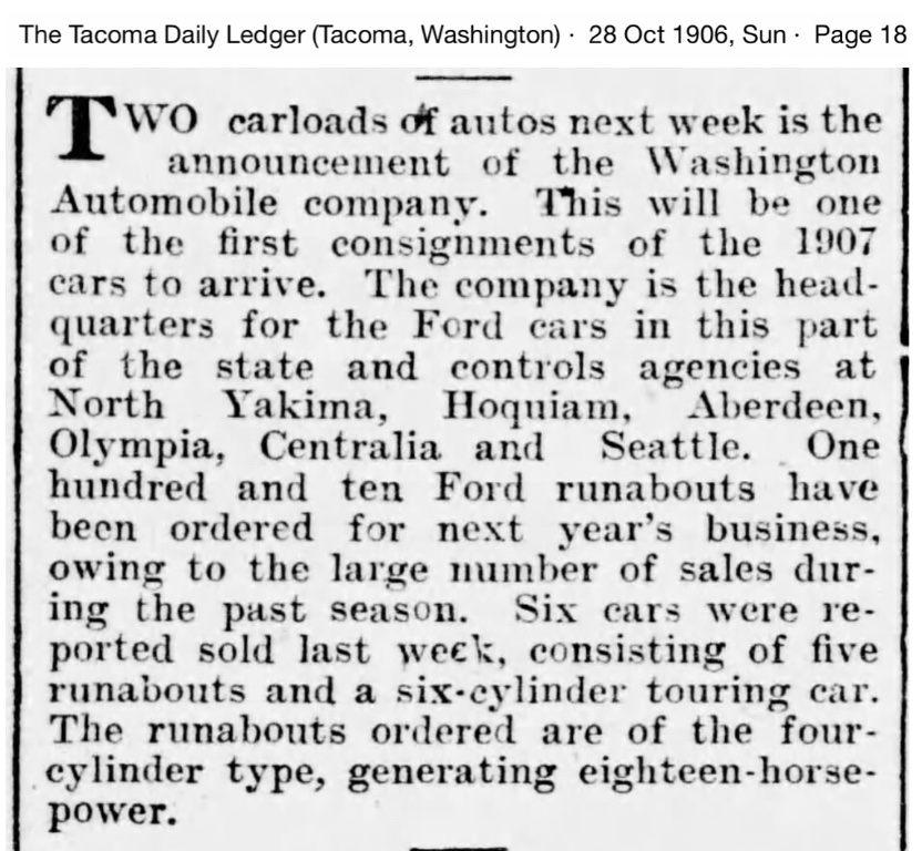 This article reports that by early 1906, Tacoma has 37 registered autos, and 13 are Fords: