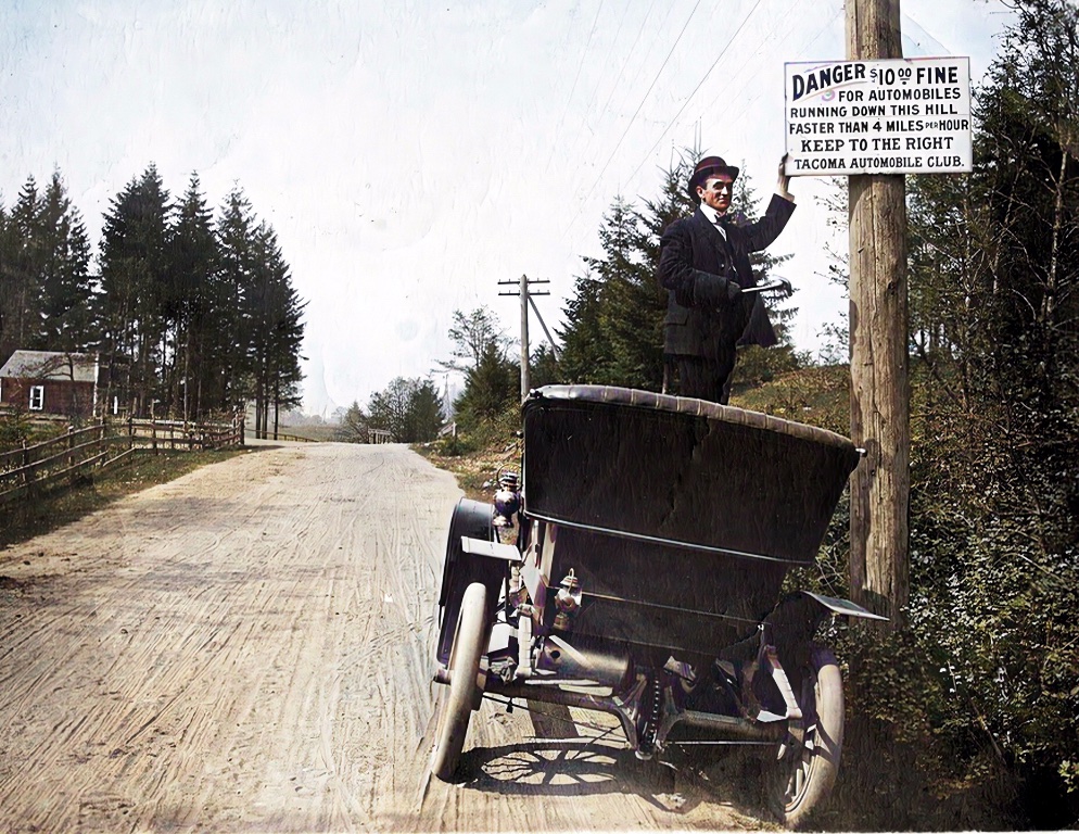And we have photos of W. W. placing the fist traffic signs in Tacoma. Driving a Ford Model F, Pickerill posts signs limiting speeds to 10 mph uphill, and 4 mph down: