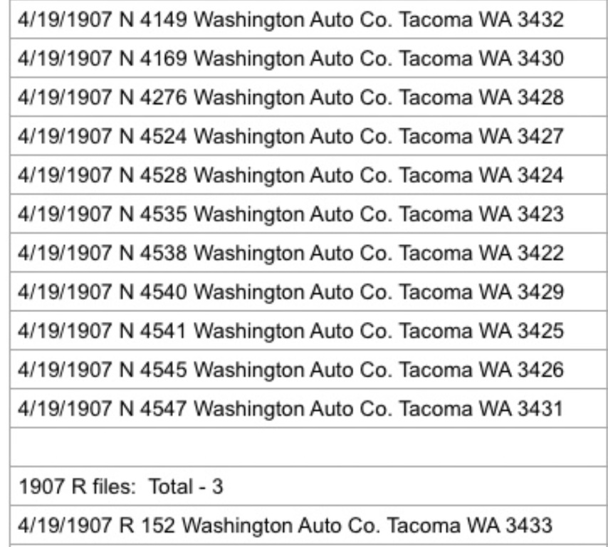 Opps, found a rabbit hole. I'll get back on this after reviewing "new" information. I should have looked before starting this thread, but it turns out Trent Boggess Ford Ledger database includes the Washington Automobile Co.. Why didn't I look before....?