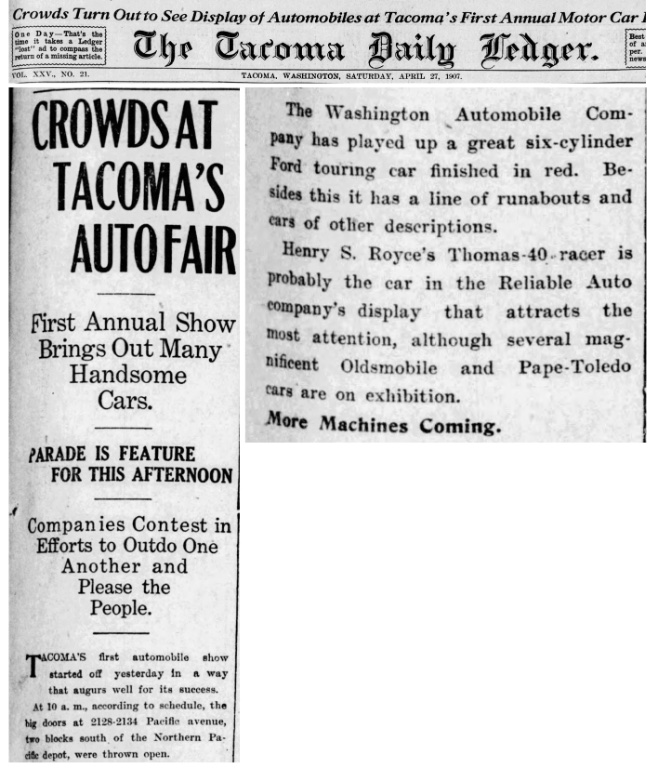One last example that W. W. had it all. He led the largest auto parade seen in Tacoma yet to begin the 1907 auto show, "his great six cylinder Ford touring car in the lead:"