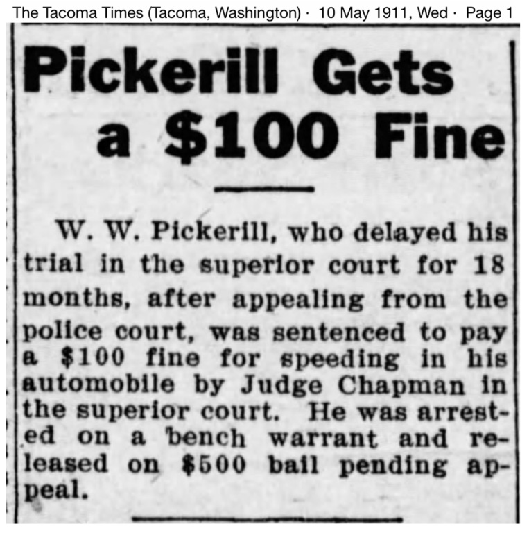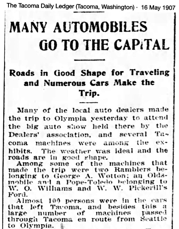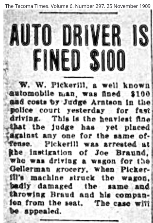 In 1926 the Tacoma "News Tribune" ran a story on W. W. Pickerill and the beginning of the automobile in Tacoma.