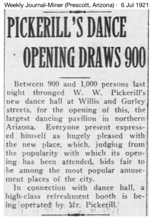 Worthington W. Pickerill moves on, landing in Prescott, AZ by 1919. In July 1921 he opens "the largest dancing pavilion in northeast Arizona" and refreshment booth."