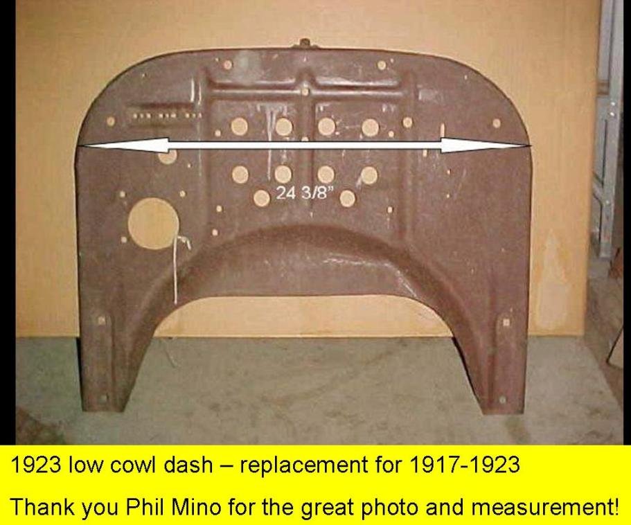 What is the width of your dash / cowl? From the photos you posted I cannot tell what size cowl you have. Below are the measurements on the metal firewalls -- but the 1917-1923 wood firewalls were the same and the 1924-25 should have been metal but someone may have replaced the metal firewall with a wooden one. Probably not -- but for dating the car -- that was a major change.