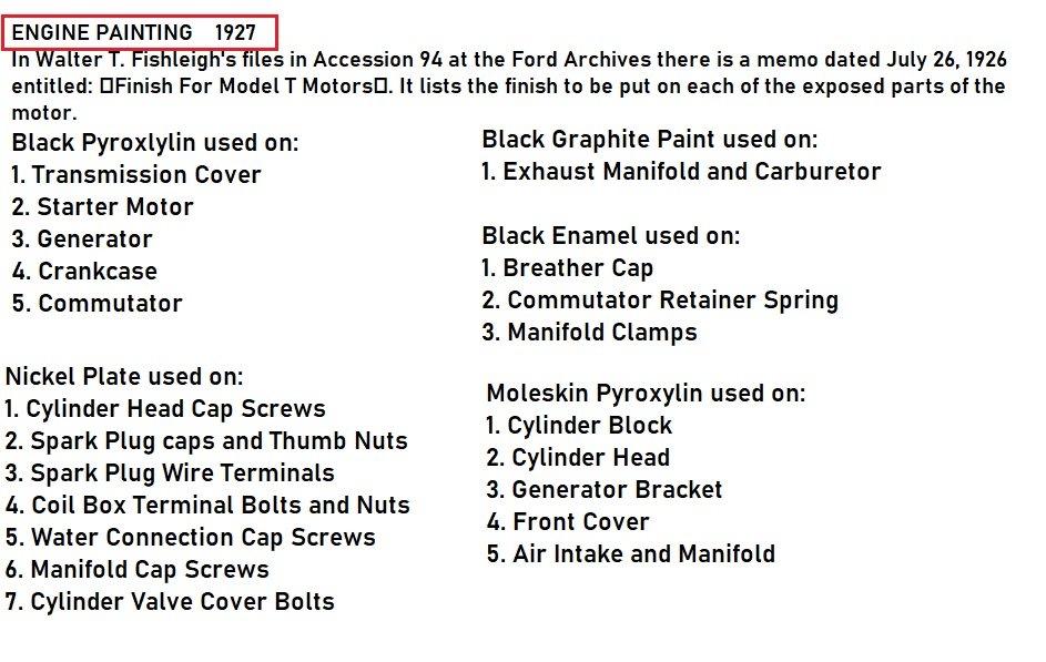 http://mtfca.com/encyclo/E.htm#eng5 Then this says for 1927 a mix of colors to dress up the engine.