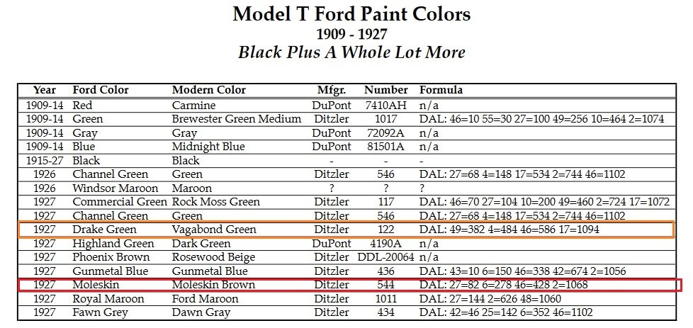 I would submit that the color Moleskin used on late T engines is a significantly different color than Moleskin Brown. Moleskin Brown is a Model A body color, it is a dark brown with a green undertone. Not close to the color of the engine pictured by Jelf.