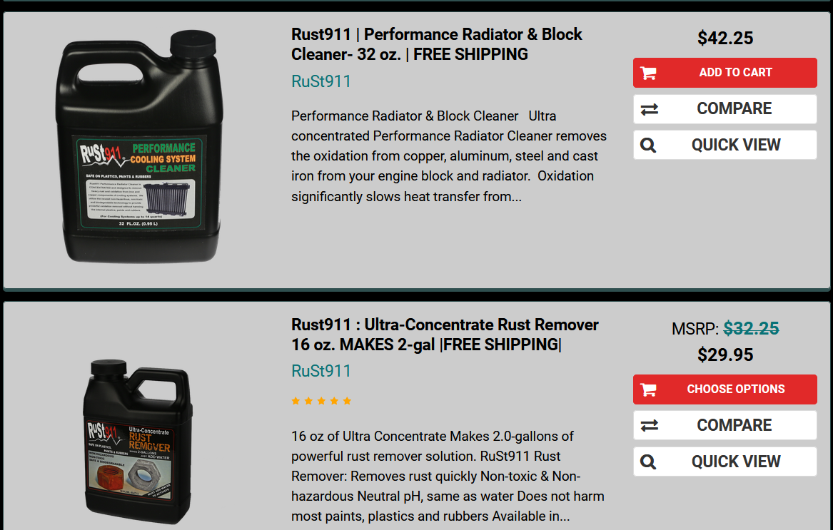 Noticing large flakes of rust in my radiator I drained and flushed my cooling system. Then I refilled it with a mixture of RUST911 concentrate. I left it in for 24 hours, and even drove the car with it in without any problem. When drained the clear concentrate came out black. I repeated the operation and this time it was light grey. After the third application it drained clear. By removing the hoses I could see sparkling clean block and head. The radiator was also rust free. No flakes at all. I chose to refill the system with Waterless coolant. No water = no rust.