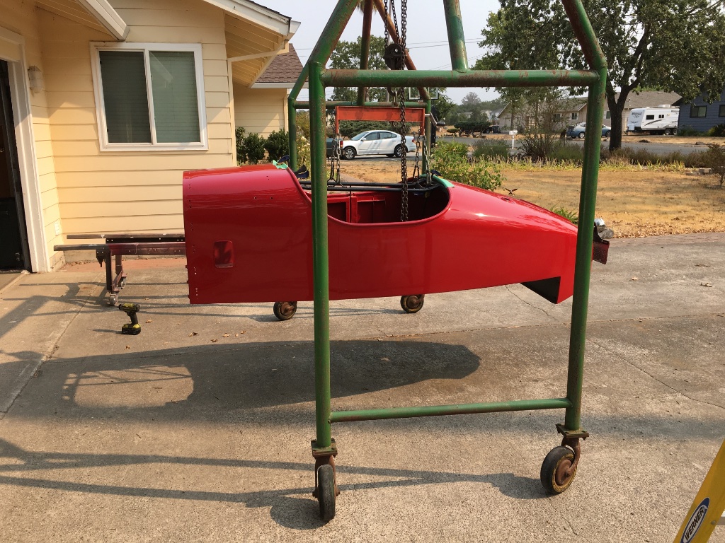 It seems I haven’t gotten anything done on the Mercury in months, so today I set the body on the chassis. Now I can finalize the chassis mounts and design a new fuel tank. I moved the body back an inch and a half for more “Rajo room”. And yes I tried not to think about the paint cost when it was hanging in the air.