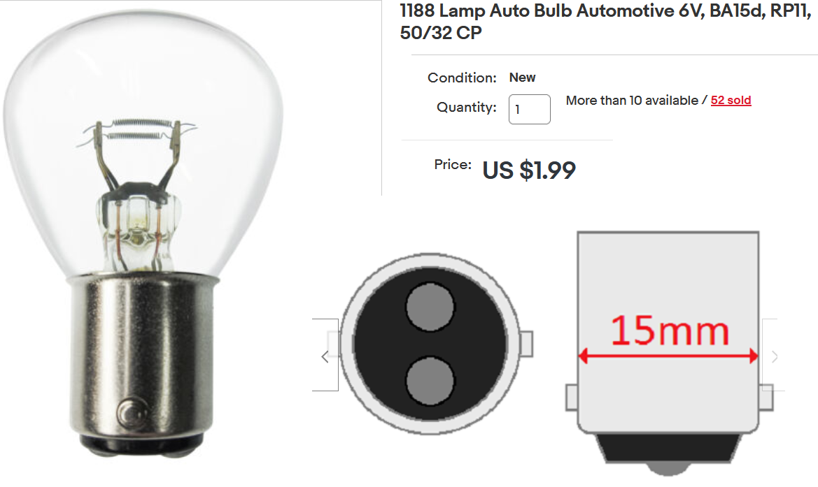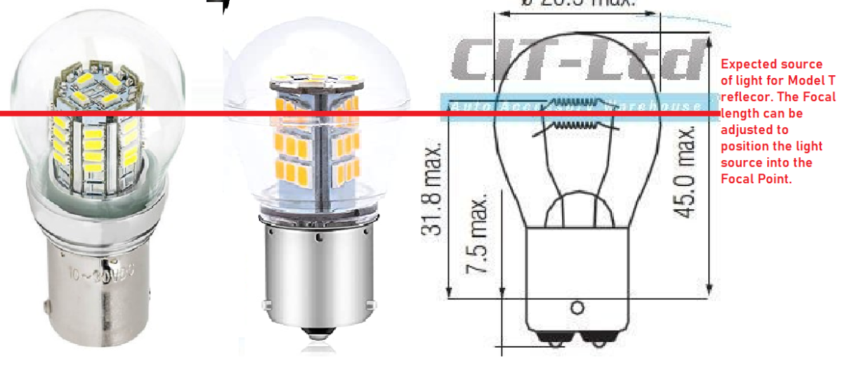 The diagram was my own making to help explain the meaning of pin-point. There are many designs of LED 1156/1157 replacements. 1156/1157 bulbs are indicator bulbs, BA15 (horizontal pins) and BAY15 (off-set pins) bases respectively. 1156 is a single action running/turn signal while the 1157 is dual action running/turn signal & brake light. The suffix applied to the base indicates the internal contacts S for single or D for double. Now the headlight filament bulbs that the vendors sell are actually 1188 bulbs 50/32 candle power. Note that the reflector is what magnifies the CP of the bulb to a 50CP bulb may project 20,000 CP and it is the lens that aims the light. Again a very bright lens doesn't mean that the light is focused, in fact if viewed from different angles the amount of difference indicates what is actually being aimed.Luke wrote: ↑Sun Nov 28, 2021 6:13 pmFrank, I wonder where that image in your 8:45 post came from? It looks to be comparing LED tail-light/indicator 'bulbs' to a later incandescent bulb with regard to headlamp focal points?