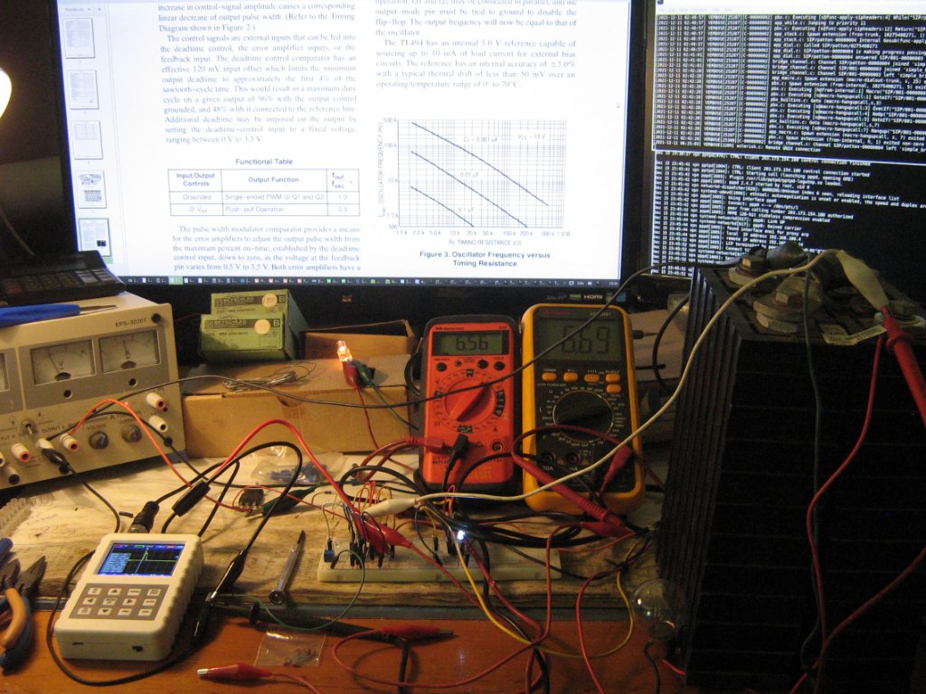 For those interested in the TL494 I've been working with here are some pics of it in operation, and a rudimentary circuit diagram.