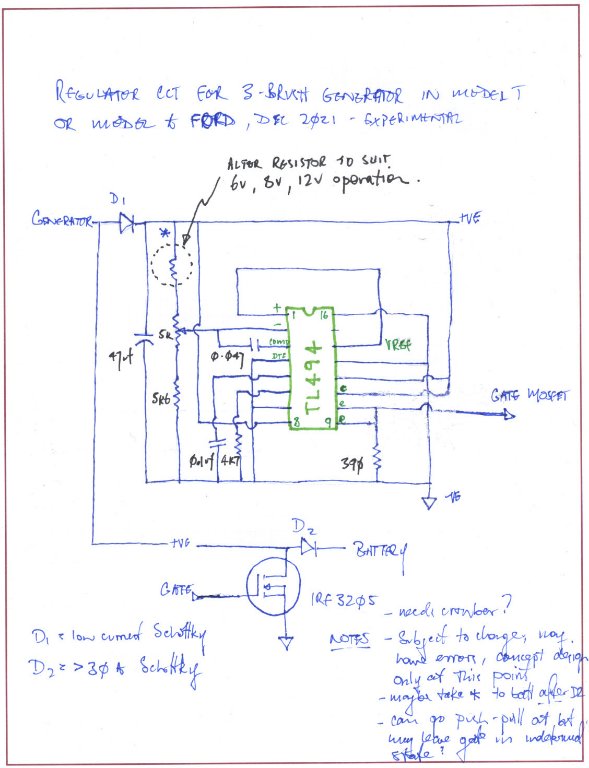 The TL494 circuit is going to need more development. I built up a prototype which worked well on the bench, but not in the car. The higher switching frequency, combined with the generator inductance could be part of the problem. It is suffering from a low frequency oscillation. Also, some ignition interference is evident. Next thing is to try to simulate the peculiarities of in car operation more closely on the bench. The comparator regulator is still working well, and if anyone wants to build one up I think it's ready for others to try.