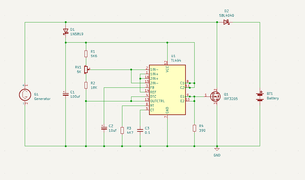 Once the voltage from the generator (bench supply) rises sufficiently the 494 starts operating again, and if the level rises further to the set voltage it begins to modulate the output transistors nicely, effectively [shunt] regulating the output to the battery.