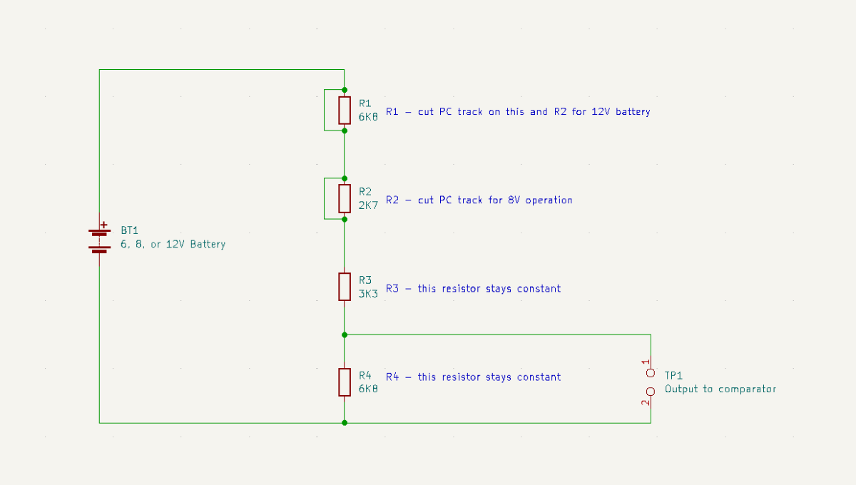 Note that the resistor divider values (R1/R2) are simply what I had to hand and presently suit a 6V operation, in practice the pot (VR1) could be done away with, thus reducing the component count, however I find it handy at the moment.