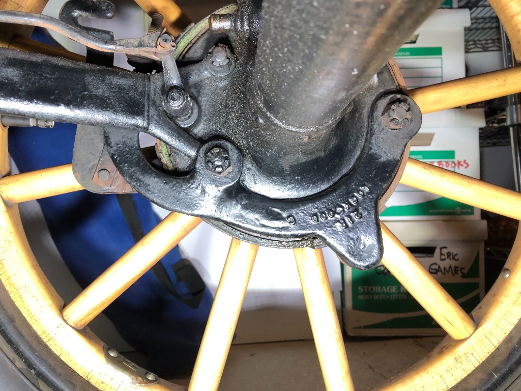 A week or so ago, our 1914 T touring made a funny noise while riding around town. I couldn't place the noise, so I didn't worry about it. Inspecting the rear wheel last evening, I see that the band on our accessory brakes (LOCKWOOD or LOCK GOOD brand) has snapped in two. These brakes have served us very well since 1969. When adjusted correctly we can lock up the rear wheels going forward or reverse when used with the stock transmission brake. I relined these in 2009 with the McMaster Carr green woven brake material mentioned in other posts. I have been stopping trouble free since then. Up until now. Inspection of the broken band shows wear down through most of the lining, but the band itself just snapped tearing the remaining lining apart. See photos, below.