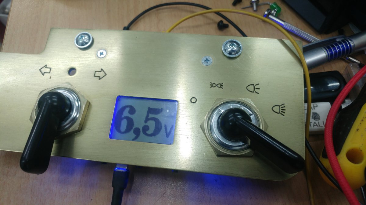 This pictures show the dashboard before it was finally mounted from front and back side. (The green LED above left switch is missing.)