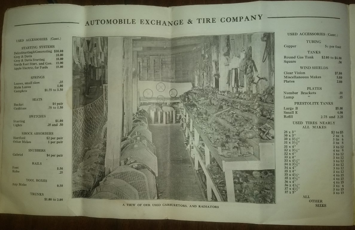 While sorting through some boxes of literature, I found a 12 page catalog from the Automobile Exchange and Tire company. This is the back cover photo of the yard. I believe this was posted in a horseless carriage gazette a few years back. This photo was taken in 1919. I wonder what's at that address now?