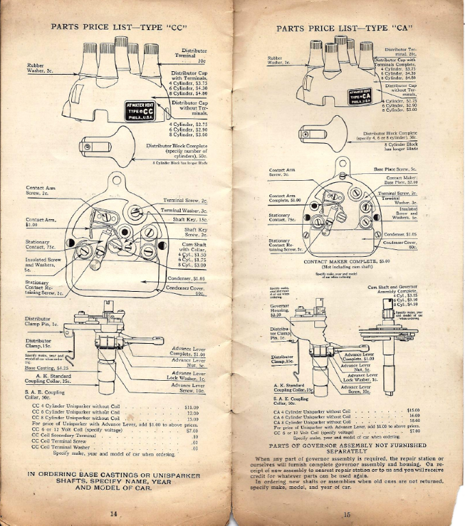 Stock engine, 6V, Bosch distributor on an Atwater Kent housing, manual advance, and standard coil.