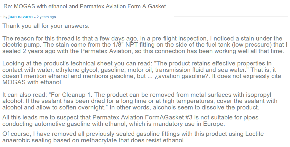 I suppose it's a fact of life that much good advice on the Forum - advice with decades of use, experience, and success to support it, often has a way of becoming as worrisome as a lit fuse on a stick of dynamite. The topic then becomes centered around the imaginary dynamite. I don't know why driving a 100 year old car with no brakes in modern traffic is nothing to worry about, but the risk of a failure of a sealant is...a sealant with a nearly incalculably small area of exposure to a fluid containing a small percentage of alcohol. If that's the case, then never fear, there is an expensive, Model-T-owner-worry-resistant product called Loctite 545 as mentioned above.