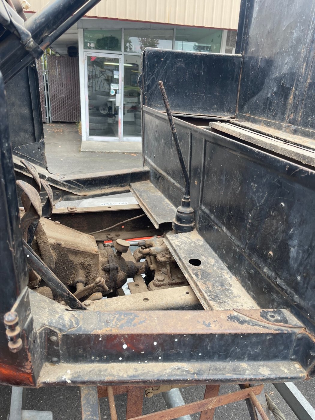 The story is it was use in the wood for a logging operation. I was thinking the transmission was turned around because the bend in the lever looks factory, don't know if you can reverse the lever or top on them. Also, the end facing the T transmission, does not look like it could be bolted up the Chevrolet bell housing. They might have been going for real low speeds and extra pulling power. Chevrolet is what I was thinking too.