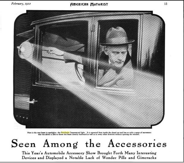 "Here is the very latest in spotlights – the Pathfinder Innercontrol light. It is operated from inside the closed car and has so wide a range of movement that the driver is able to throw the beam directly backward as well as in every other direction without opening the window."