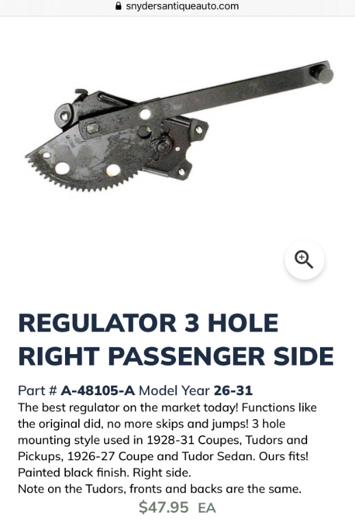 I think these are the same as the front door of the opposite side. There are some Model A regulators that work and may even be an exact match. Talk to the technical person at Snyders and they should be able to tell you which one will work. If I remember correctly, they were $40.