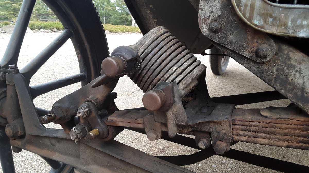 These accessory shock absorbers are on my '14. I would appreciate any help confirming whether or not they are early Hassler shocks. I've never seen another set. The design is certainly similar to the common bee hive Hasslers with the obvious differences being the spring design and the grease fittings. Given the initials RH (Robert Hassler?) and RHC (Robert Hassler Company?) cast into the parts I'm assuming they are early Hasslers. Maybe prototype/test marketed? The T in the Wells ad below from The Fordowner magazine of September 1914 has identical shocks on it. There is no ad for the shocks. The bee hive style were being advertised by sometime in 1915 .