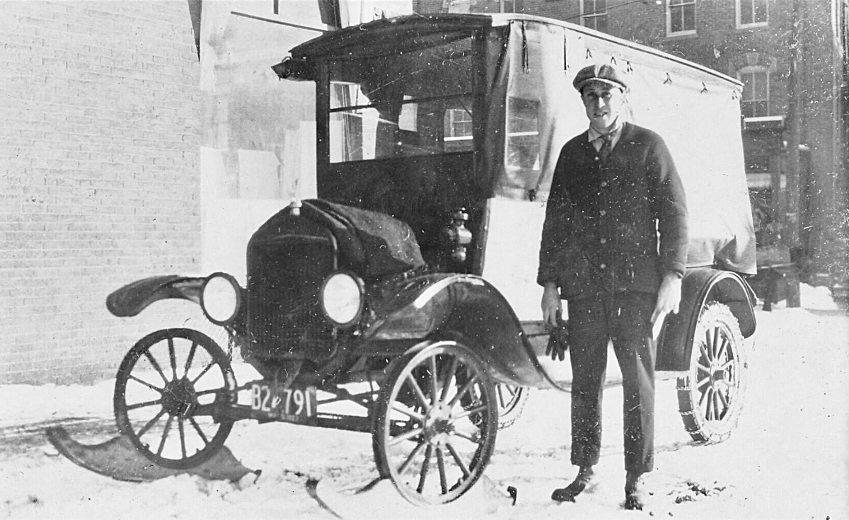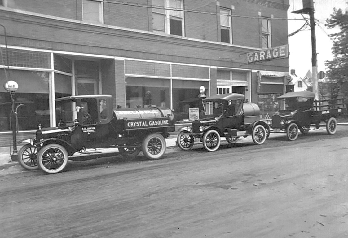The Crystal Gasoline tanker is a unique combination. It appears to have an ordinary roadster body mounted onto a TT, and that body has an accessory California top. The photo suggests it is a new truck.