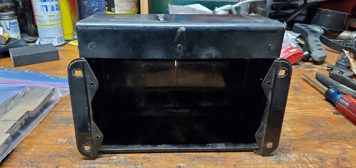 From the standards: "Ford design steel coil box with sloping cover with no switch. Cover was the three-piece design. painted black."