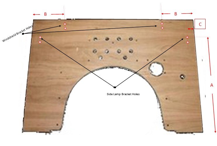 I am needing the factory location of the holes for the side lamp brackets (-both the 'A' measurement and the 'C' measurement), ...and the location the windshield clips are mounted inboard (-the B measurement) from the edge. Can anyone help me with this??