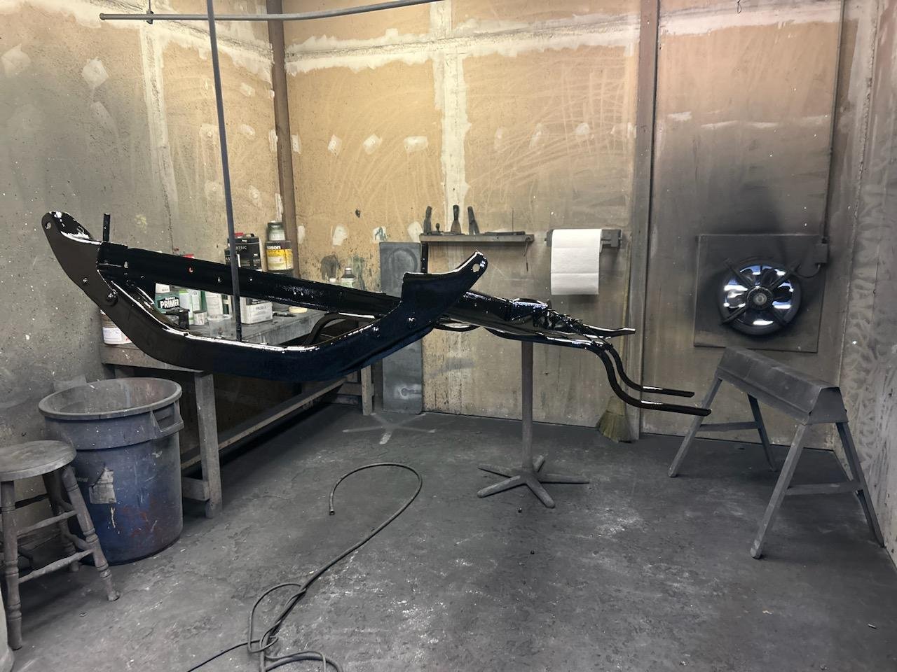 The project continues. While many of you would be well founded if you thought the project had been abandoned. It has not. Currently it is coming back the other way. Don Booth has completed the woodwork on the body and Mark Eyre painted the frame this week. The car is coming along nicely.