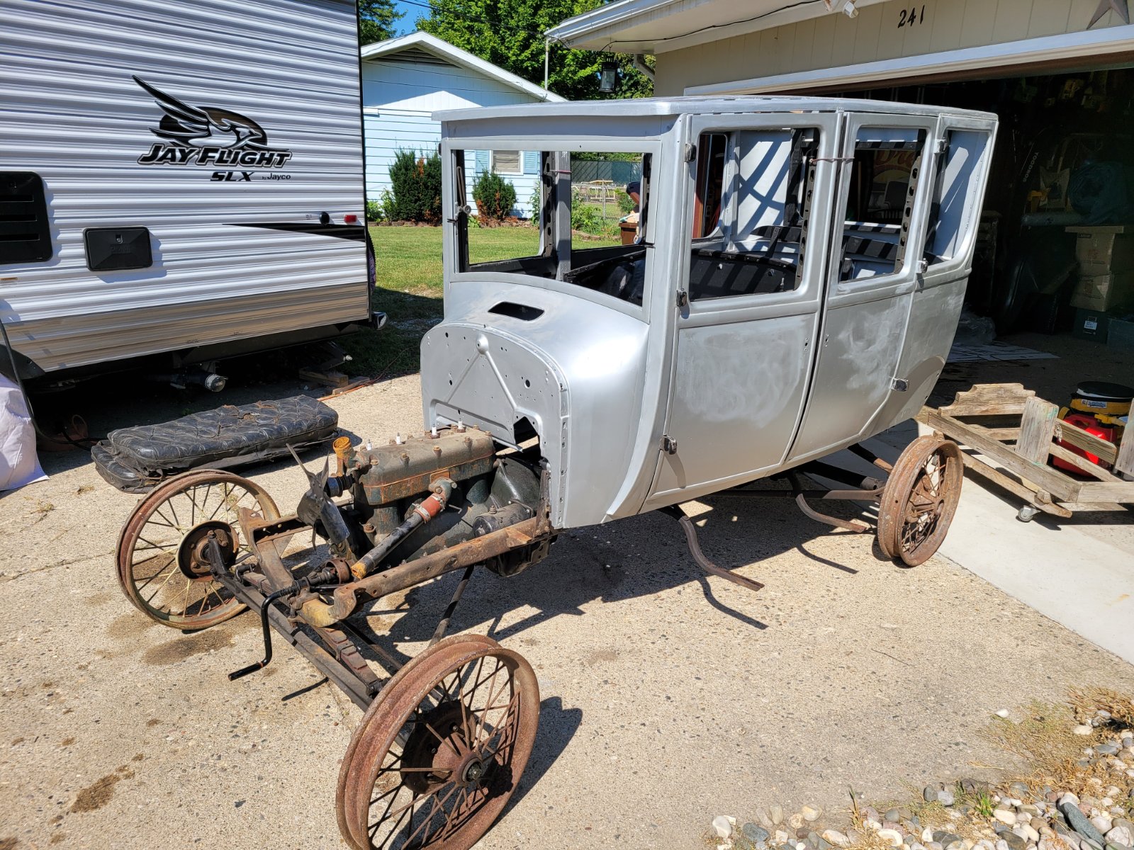 Wayne, the point is fair. I intended to jump directly from the '26 Touring restoration to restoring the Fordor. At the time I was single, taking classes toward my Ph.D. and my parents were in pretty good health. In the intervening 20 years I have gotten married, acquired 4 kids, completed the Ph.D, lost both parents and a brother in law, moved, replaced both knees, sold four houses and....on and on. Finally, last week I looked out in the garage on my dad's birthday and said, "it's time."
