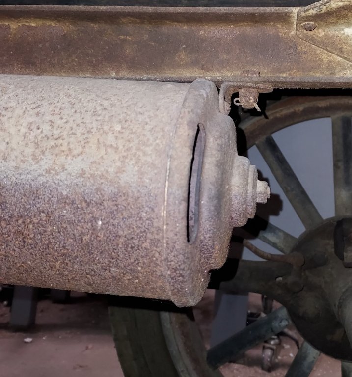This is an original Ford 1924 exhaust, same as used on 1926-27. The exhaust pipe goes all the way thru the muffler to the back of the steel end and is held on by a stud and nut, the exhaust pipe has a bead rolled into it at the front steel end and these features are what holds the muffler together. The exhaust pipe and muffler become a one piece part for vehicle assembly that is fastened to the car at two points, the exhaust manifold in front and the ear on the rear of the muffler on the back. No muffler clamps because there are no pipe joints at the front of the muffler.