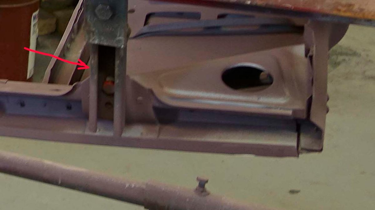 Here is a much-enlarged shot of the brackets in question. The photos are hampered by a metal channel used to support the body when it was on the rotisserie. The metal channel is marked by the red arrow.