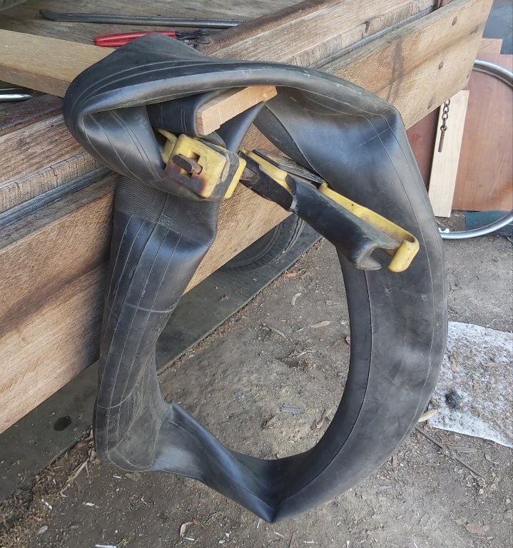This is a legendary Olympic butyl rubber tube. These hold air! This one had the rubber valve stem torn off. It had been replaced with a stick-on rubber stem which was too short and had let go again on one side where the glue had not cured as it should.