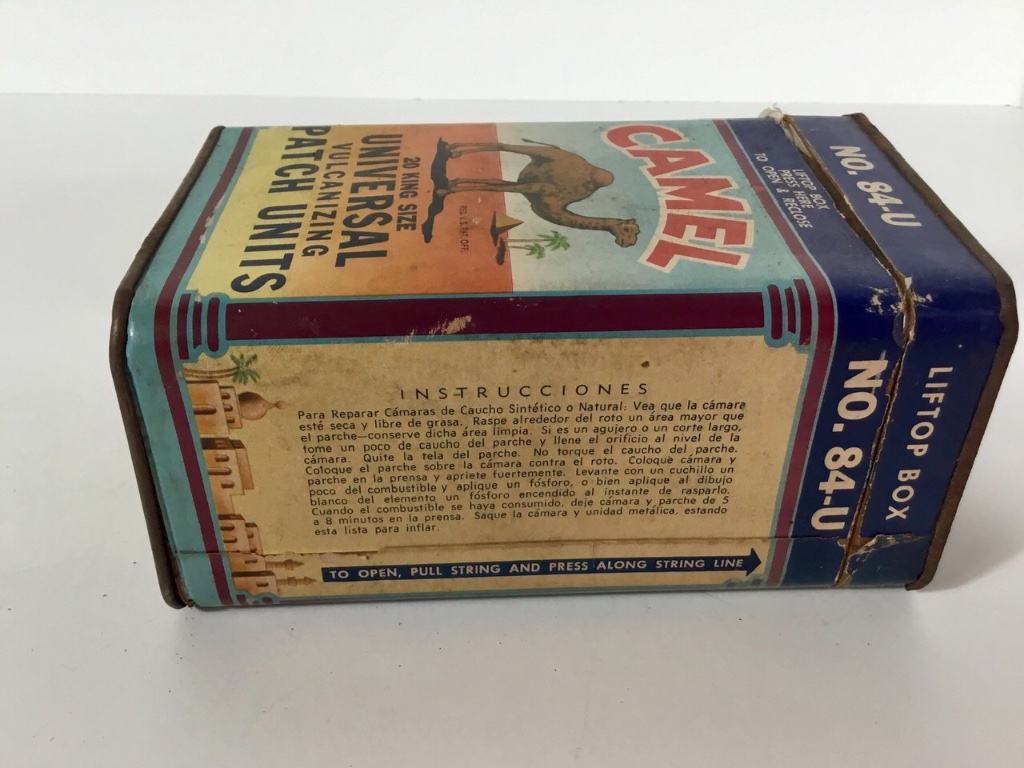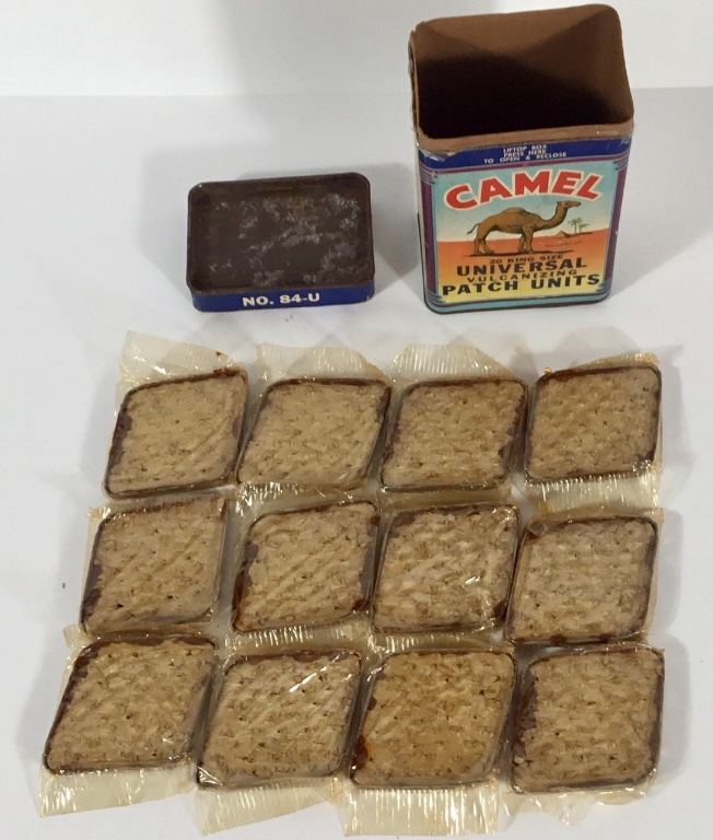 Here is a box containing Camel tire tube patches that I sold on eBay. The rubber patch trays sealed in plastic packages have cloth saturated with fuel that is lit and the and the patches are affixed to the leak using heat. Jim Patrick