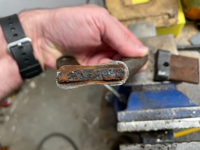I am making some custom rear radius rods to fit the lowering brackets I made for my speedster project. I could make entirely new ones, but I wanted to modify original ones to make them more period. I needed to shorten the rods and make new “forks” to clear things. I am also taking the opportunity to drop them down slightly to make a bit more frame clearance. Anyway, I was cutting the “forks” off of a set of pre-26 rods and discovered that Ford built these with a 1/4 inch thick plate installed inside the outer tube to reenforce the fork. I cut around the tube then pulled the plates out so I can slip the new plates inside before welding and riveting them to the tube. I discovered that on one of the rods the 1/4 inch plate was rusted clear through but the much thinner tube was in pretty good shape. So, they must have used a much lower quality steel for the reenforcement than for the tube. Just thought how they put them together was interesting.