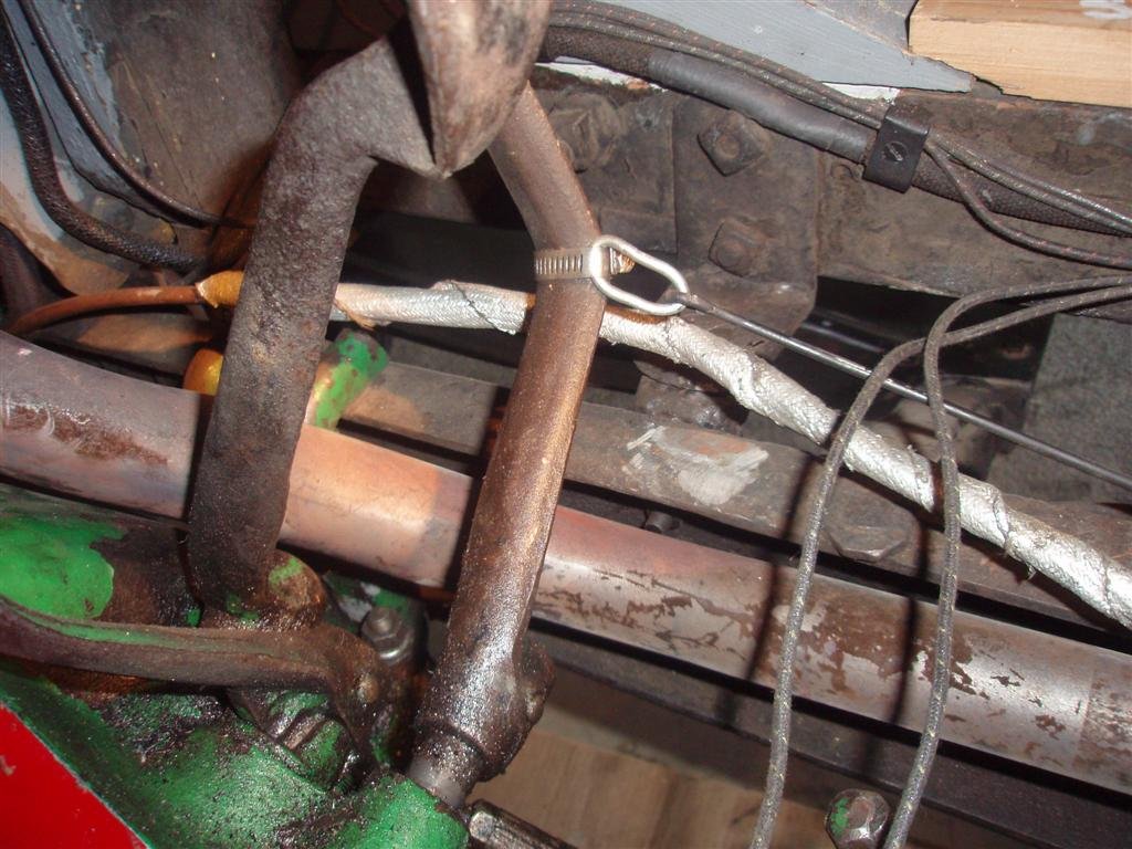 The hose clamp on the brake pedal clamped one end of the baling wire (using a ring for articulation - see picture) with the other end attached to the spring. The spring then attached to switch. It is set to 'rest' when the pedal is in 'normal'. When the pedal is pushed the spring takes up the movement and pulls the switch.