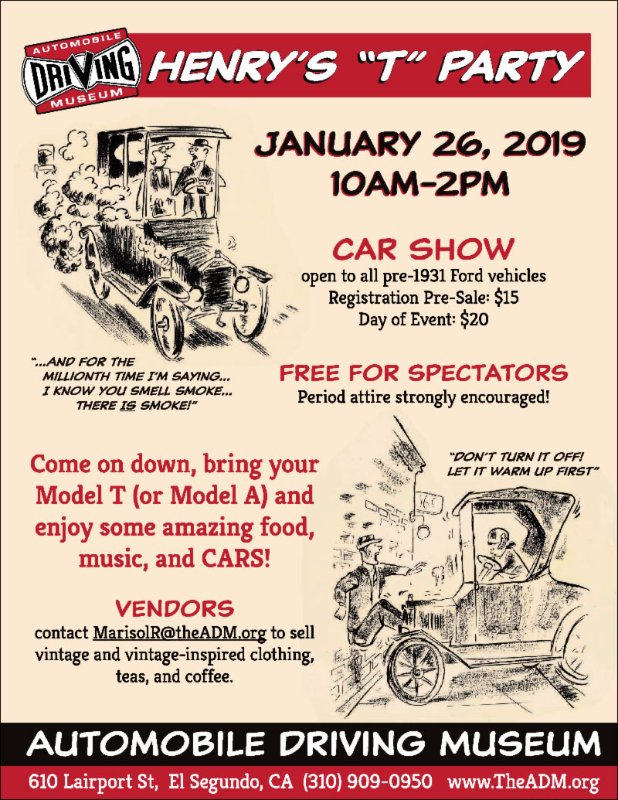 Re: Automobile Driving Museum - Henry's "T" Party - 1/26/19