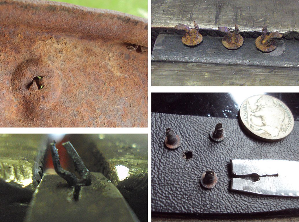 My '25 steel dash (Firewall) has three rivets in addition to the ones for the hood lacing. They were to hold a strip between the dash and the body to either seal it from water or prevent squeaking. I take some pride in making this car as close to original as possible but I don't consider myself a purist. However it was very satisfying to use some original rivets to attach some leftover top material with them. I tried to remove them without mangling them. Then I annealed them hoping they wouldn't break in reinstalling them. A hole and slot were cut in a thin steel plate to hold the rivet while straightening the tangs. Some time was also spent each time one fell on the floor. They are a bit small for these old eyes to spot.
